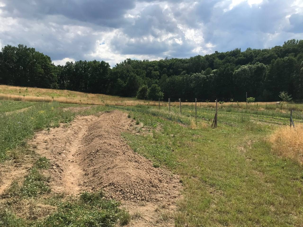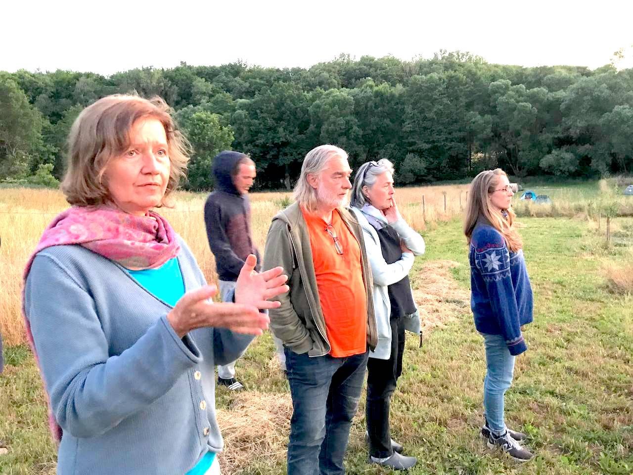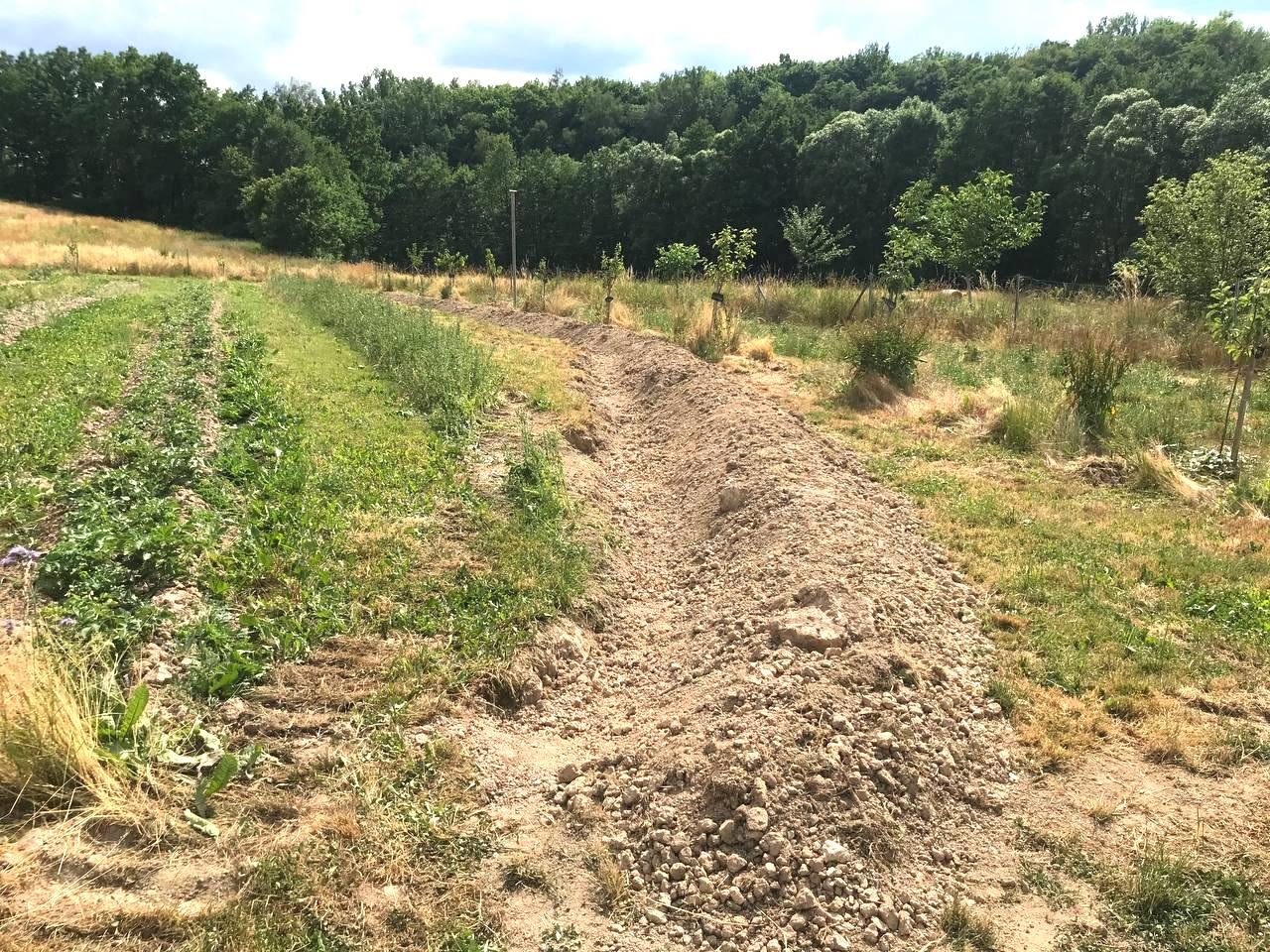Hier haben wir mehrere Swales (Wasserretentionsgräben) angelegt und mit artenreichen Säumen eingesät. Gemeinsam mit der Gemeinschaft vor Ort und mit externen Teilnehmenden haben wir an vier Tagen den Hof erkundet, eine Wasserrückhaltung geplant und dann umgesetzt. Vorbereitet wurde dieses Seminar mit dem Wasserexperten Thomas Lüdert aus Tamera im Online-Kurs.