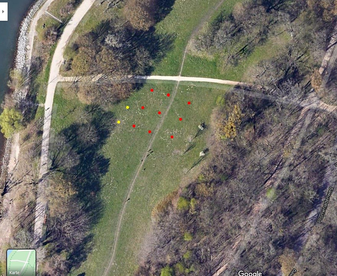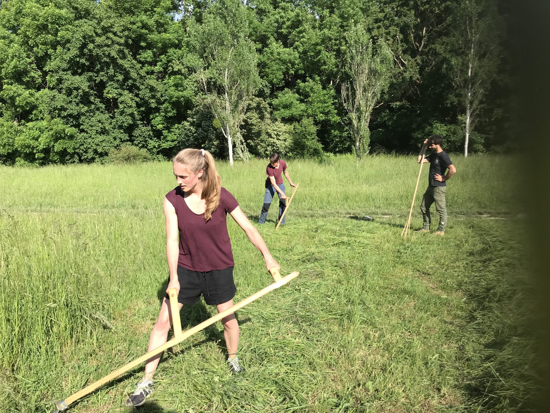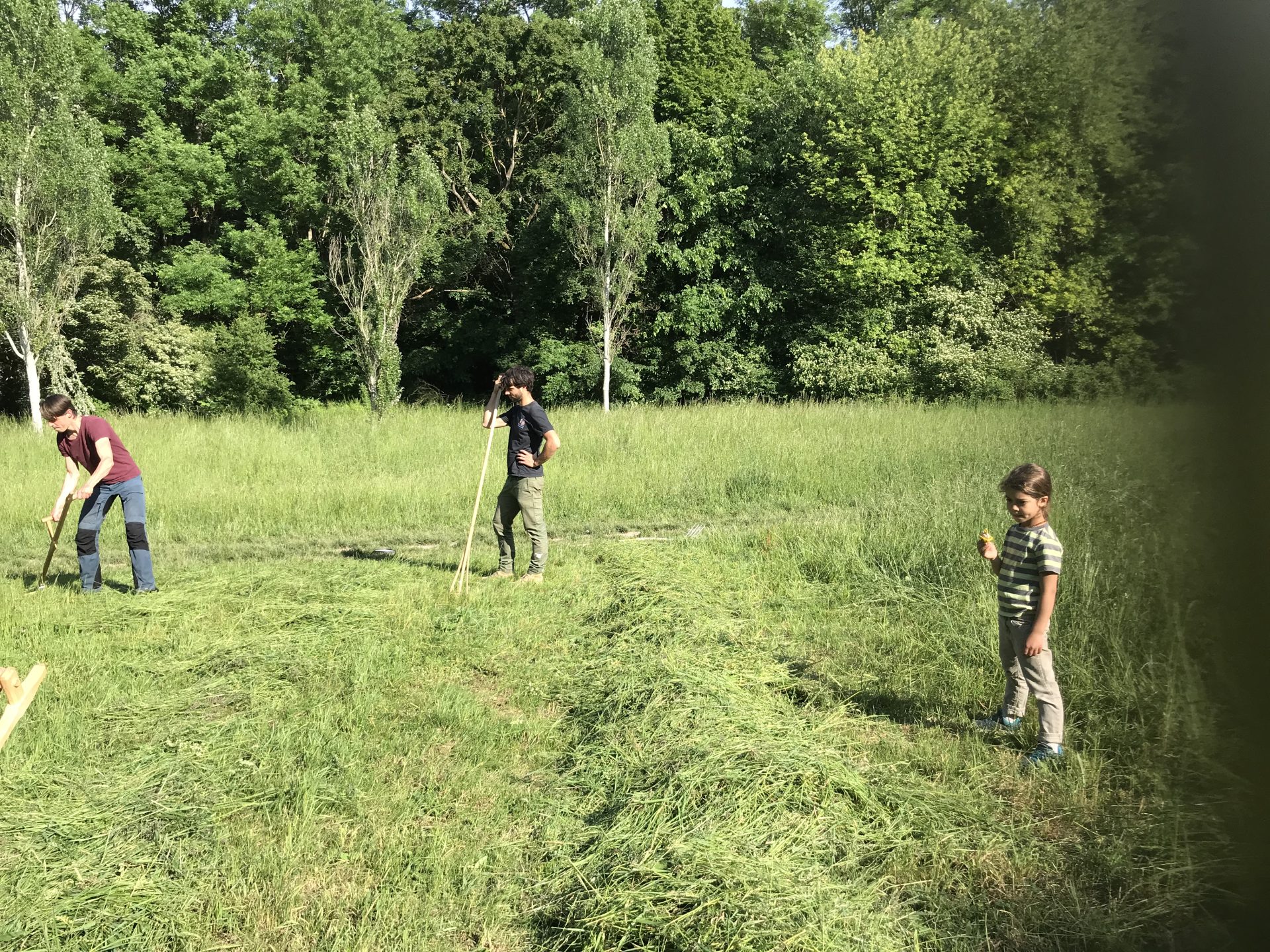 Hier gestalten wir seit 2018 eine artenreiche Mähwiese, die wir 2x im Jahr von Hand mähen und damit schon jetzt den Blütenreichtum erhöht haben.