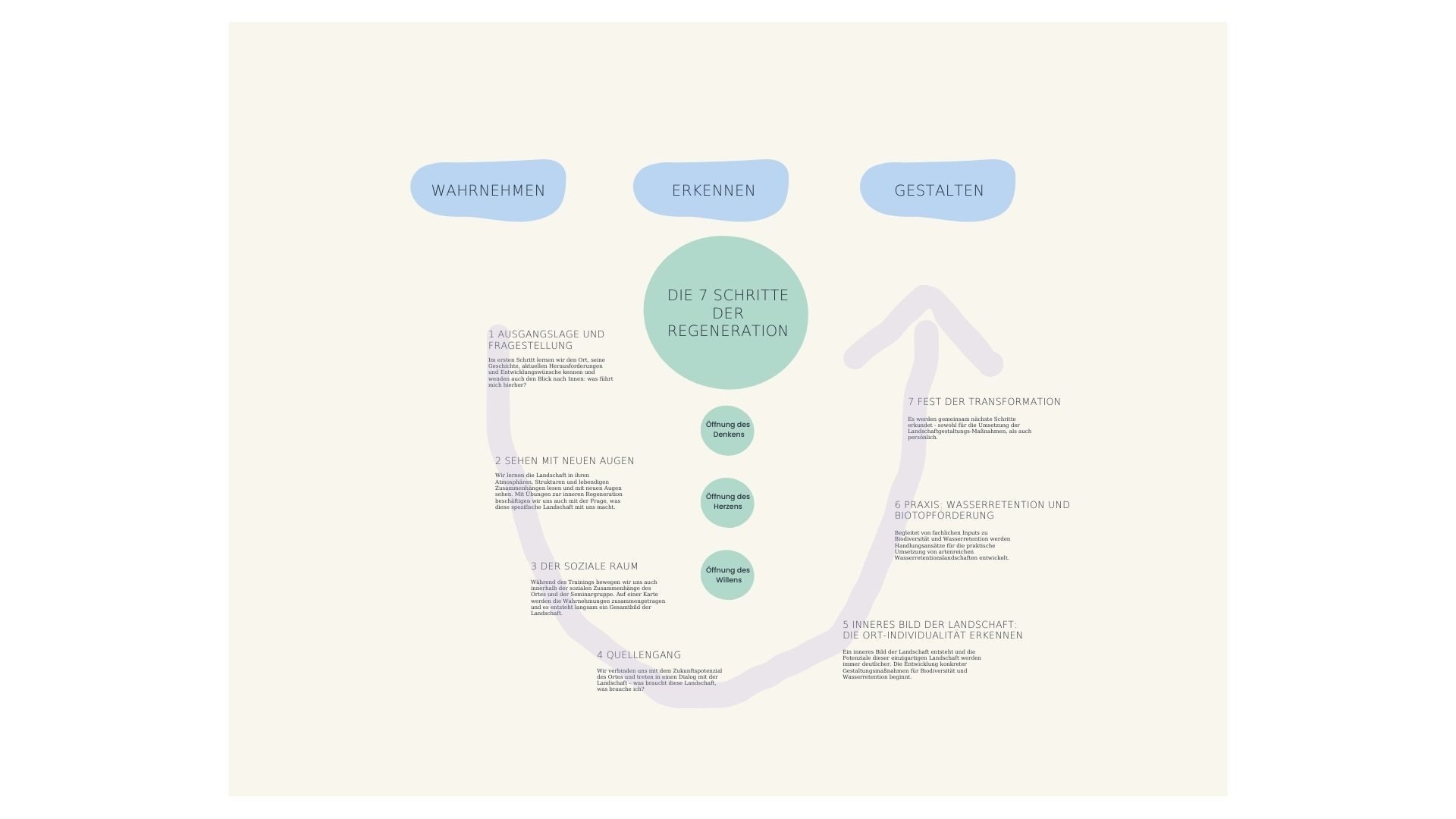 Dieser Regenerationsprozess ist inspiriert von der Theorie U nach Otto Scharmer, dem Petrarca-Ansatz für Landschaftswahrnehmung und -gestaltung, Elementen des Transformativen Lernens und Art of Hosting. Grundlage ist die partizipative, praktische und persönliche Erfahrung, die durch meditative, künstlerische und reflexive Elemente, Wahrnehmungsübungen, offenen Austausch in der Gruppe, fachliche Inputs zu den 10 Biotopen und Wasserretentionslandschaften, und die Arbeit an der eigenen Frage mitgestaltet wird.